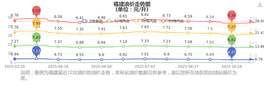 福建汽油、柴油11月19日每升的价格是多少?具体为:92号汽油为6.91元;95号汽油为7.38元;89号汽油为6.43元,增了0.09;0号柴油为6.58元,本轮调整时间为11月11日。