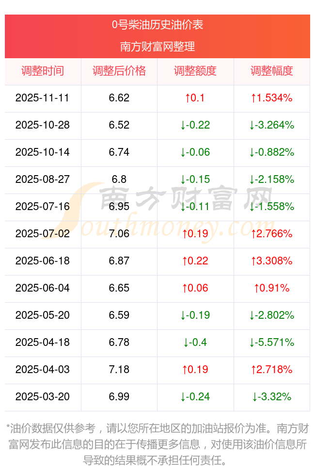 油价调整最新消息:下一轮油价调整时间11月24日24时。江西汽油、柴油11月19日每升最新价格为11月11日调整后的价格,92号汽油为6.91元,升了0.1元;95号汽油为7.41元,升了0.1元;89号汽油为6.42元,升了0.09;0号柴油为6.62元,升了0.1元。