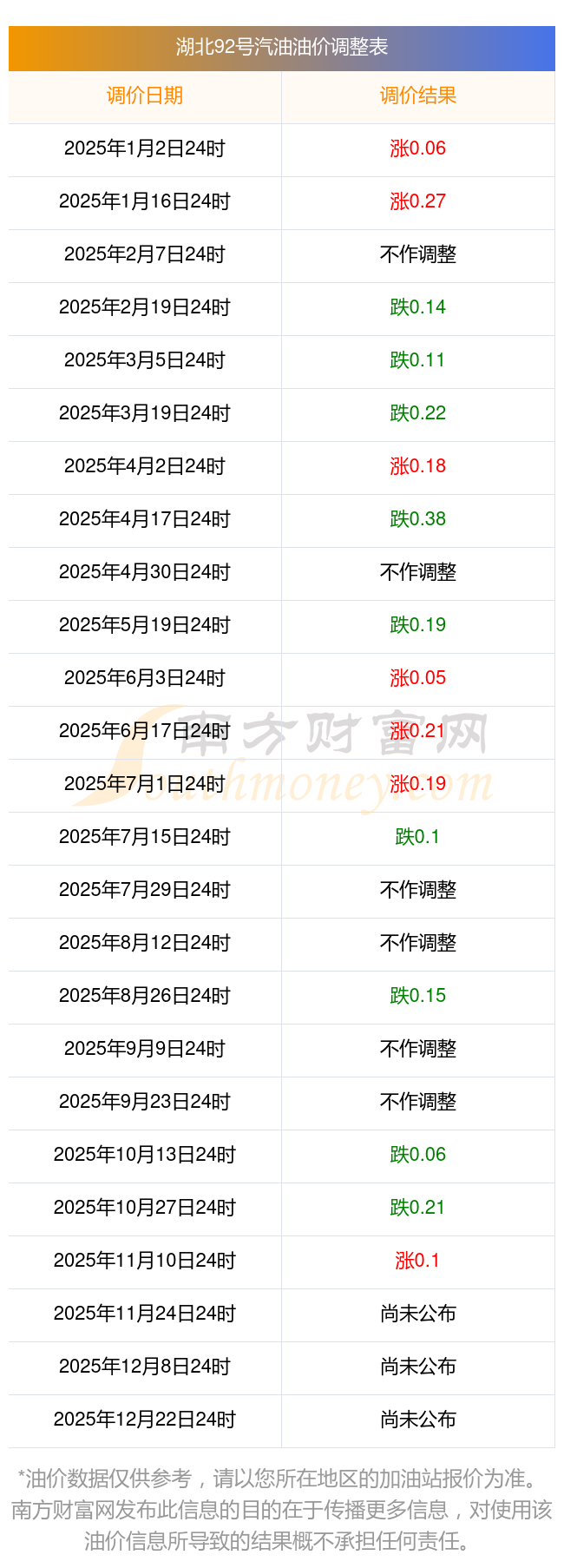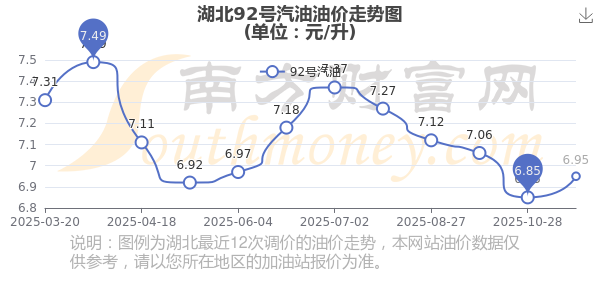 11月19日湖北汽油、柴油每升的价格为11月11日调整后的价格,92号汽油为6.95元,增了0.1元,增幅达1.46%;95号汽油为7.44元,增了0.11元,增幅达1.5%;0号柴油为6.57元,增了0.1元,增幅达1.55%。
