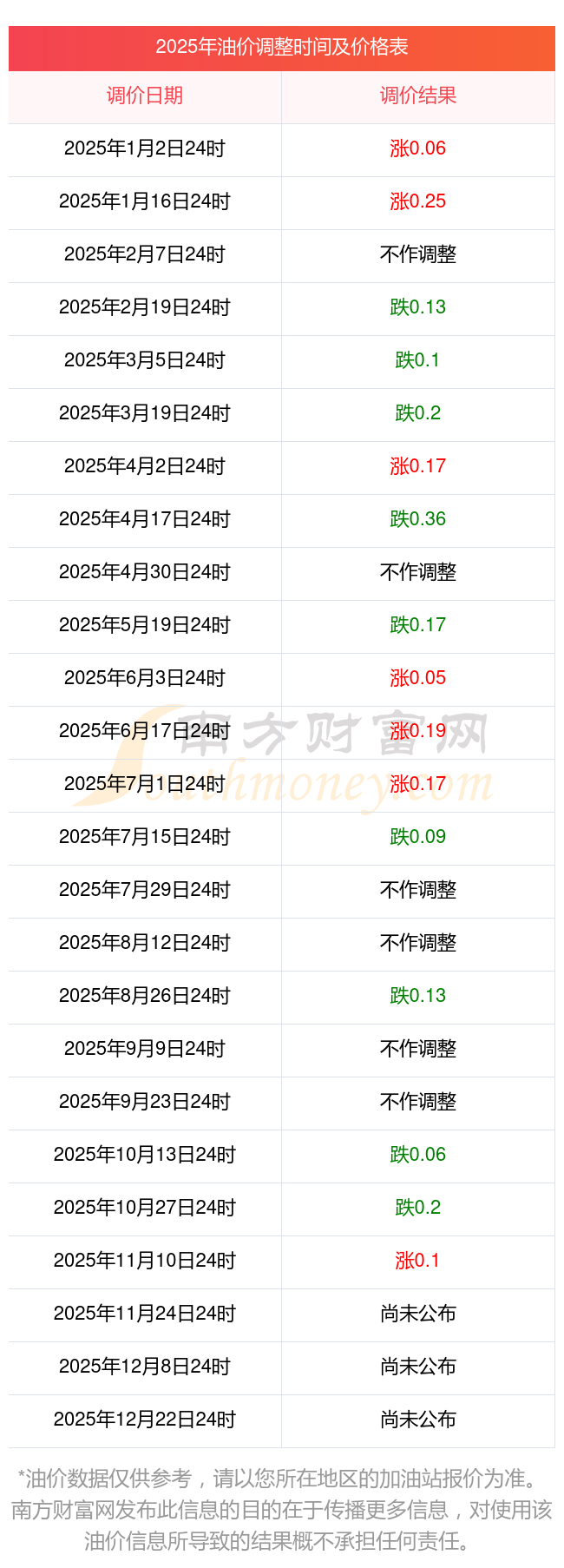油价调整最新消息:下一轮油价调整时间11月24日24时。11月19日简阳市汽油、柴油每升价格详情为:92号汽油为7.04元,升了0.1元;95号汽油为7.53元,升了0.11元;89号汽油为6.54元,升了0.1元;0号柴油为6.64元,升了0.1元,本次油价调整时间为11月11日。