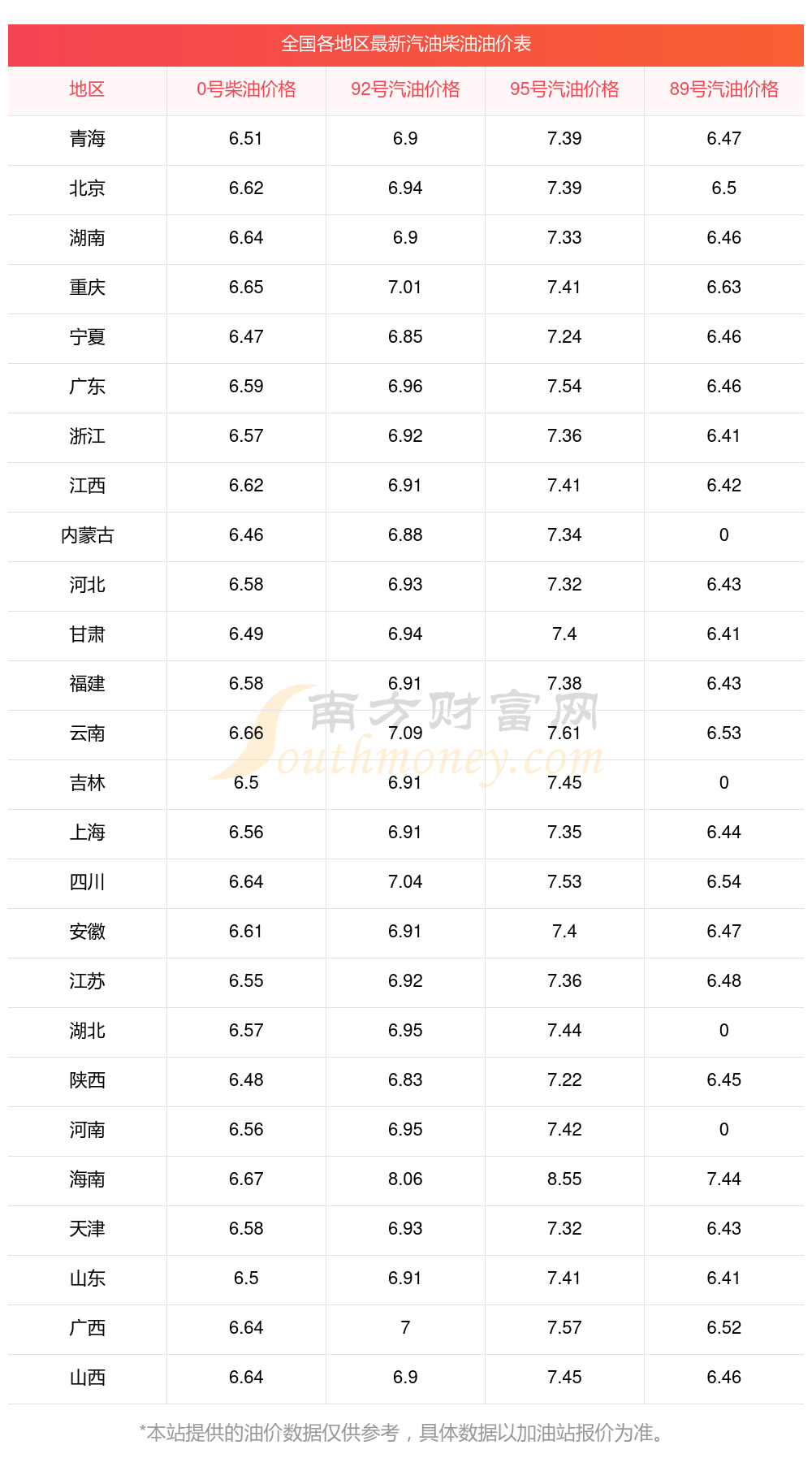 汽油价格调整最新消息:下一轮油价调整11月24日24时开启。本次油价的调整时间为11月11日,调整后全国92号汽油平均价格为7元每升,其中,最低的是陕西,6.83元每升,最高的是海南,8.06元每升。全国95号汽油平均价格为7元每升,其中,最低的是陕西,7.22元每升,最高的是海南,8.55元每升。全国0号柴油平均价格为:7元每升,其中,最低的是内蒙古,6.46元每升,最高的是海南,6.67元每升。全国89号汽油平均价格为7元每升,其中,最低的是浙江,6.41元每升,最高的是海南,7.44元每升。