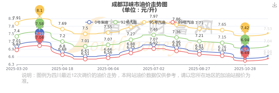 成都邛崃市汽油柴油11月19日的价格每升多少钱?具体为:92号汽油为7.04元,涨了0.1元;95号汽油为7.53元,涨了0.11元;89号汽油为6.54元,涨了0.1元;0号柴油为6.64元,涨了0.1元,本轮油价的调整时间为11月11日。