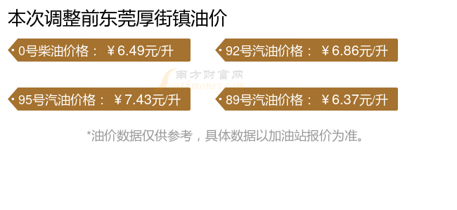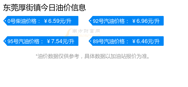 11月19日东莞厚街镇汽油每升的价格,具体如下:92号汽油6.96元;95号汽油7.54元;89号汽油6.46元;0号柴油6.59元(该价格为11月11日调整后的价格)。