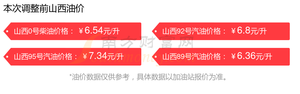 11月19日,山西汽油、柴油价格的调整时间为11月11日。每升最新价格为:92号汽油为6.9元,涨了0.1元;95号汽油为7.45元,涨了0.11元;89号汽油为6.46元,涨了0.1;0号柴油为6.64元,涨了0.1元。