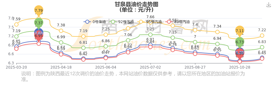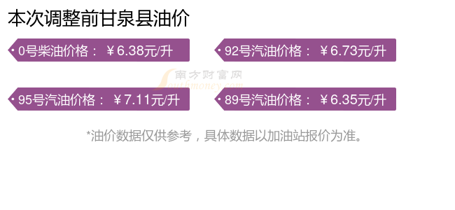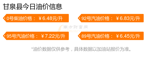 甘泉县汽油、柴油11月19日每升的价格(油价调整时间11月11日):92号汽油6.83元;95号汽油7.22元;89号汽油6.45元;0号柴油6.48元。
