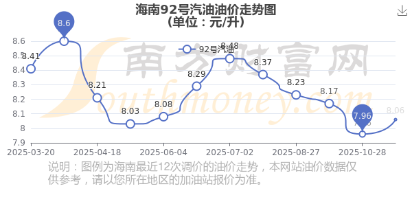 11月19日,海南92号汽油的价格是8.06元每升,本次的调整时间为11月11日,对比上次的调整增了0.1元,增1.256%,11月24日24时为下一轮油价调整时间,还有5.33天。