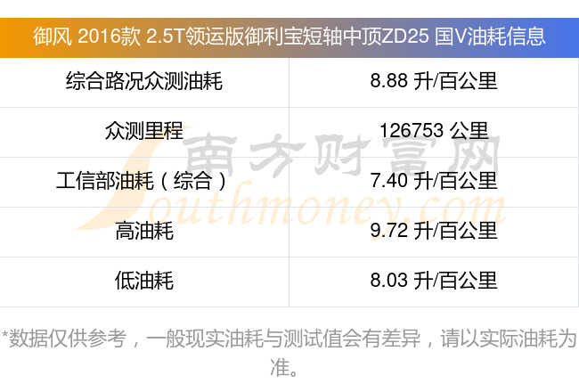 根据车主实测数据,该车型低油耗为8.03升每百公里,高油耗为9.72升每百公里,综合路况众测油耗为8.88升每百公里,工信部综合油耗为7.40升每百公里。