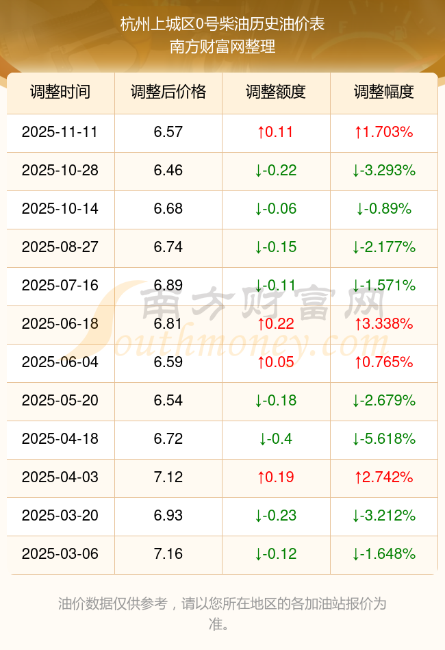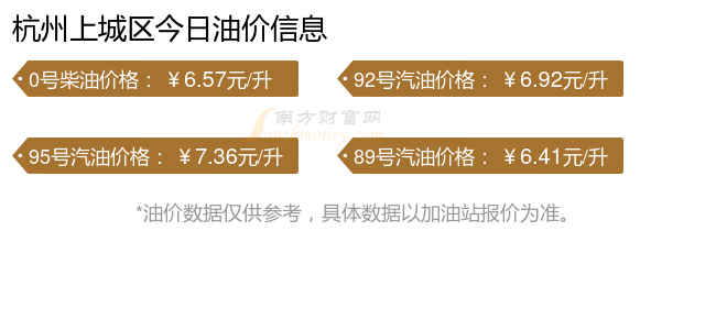 杭州上城区汽油柴油11月19日每升的价格为11月11日调整后的价格,各油价详情如下:92号汽油6.92元;95号汽油7.36元;89号汽油6.41元;0号柴油6.57元。