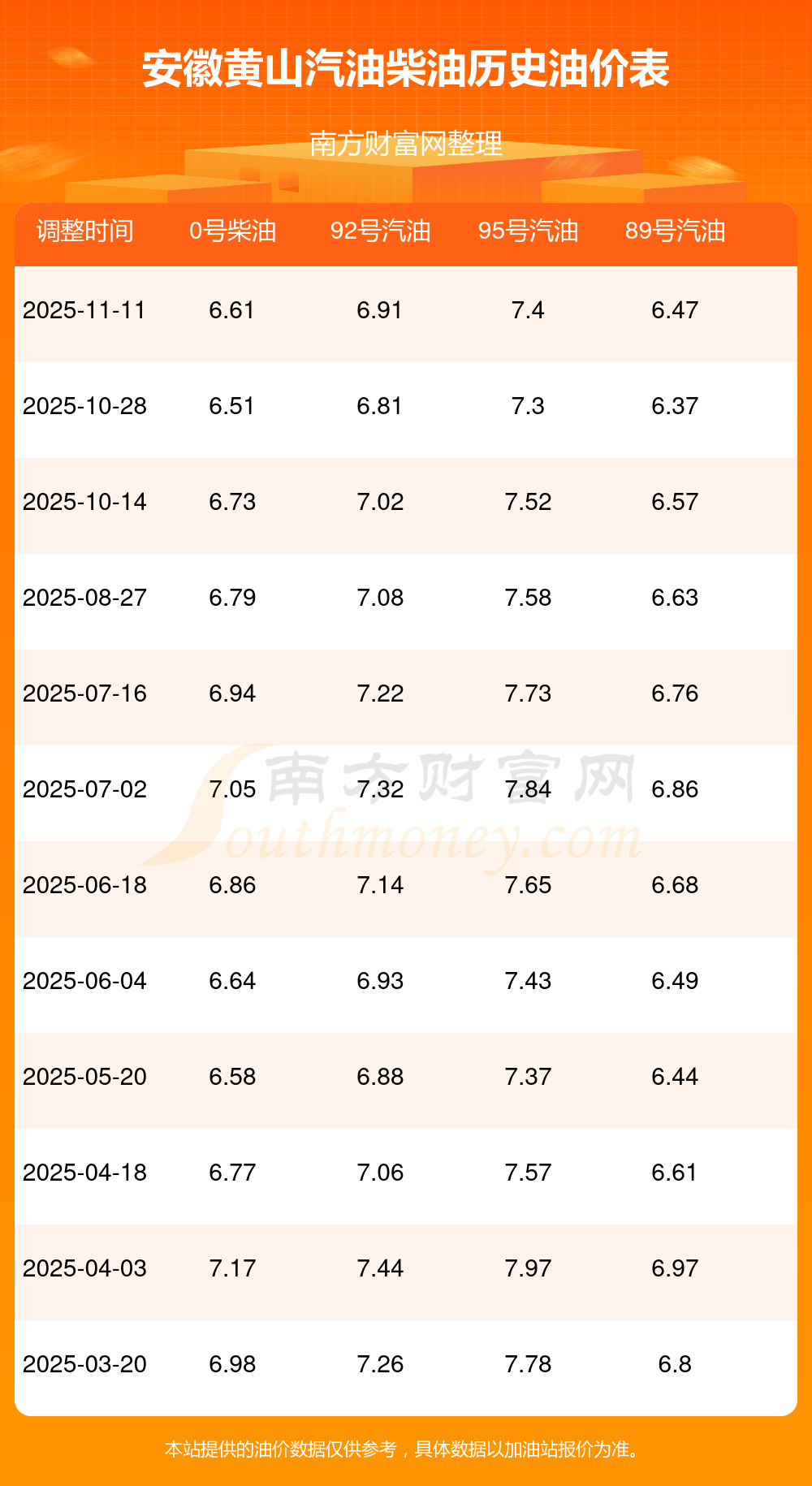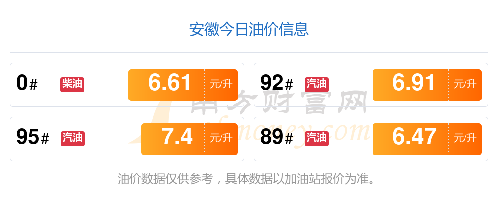 汽油、柴油11月19日每升的价格(油价调整时间11月11日):92号汽油6.91元;95号汽油7.4元;89号汽油6.47元;0号柴油6.61元。下一轮油价调整时间11月24日24时,距离现在还有5.32天。