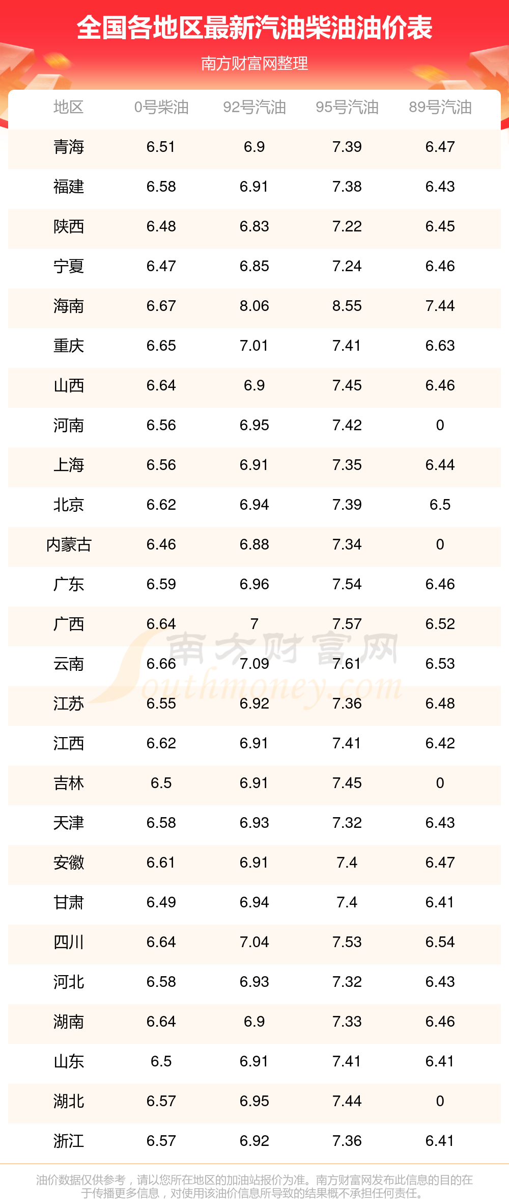 2025年11月19日全国油价调整及最新汽油价格表