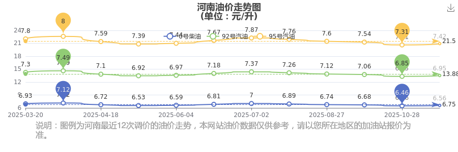 11月19日,河南汽油、柴油每升最新价格为:92号汽油为6.95元,上调了0.1元;95号汽油为7.42元,上调了0.11元;0号柴油为6.56元,上调了0.1元,调整时间为11月11日。