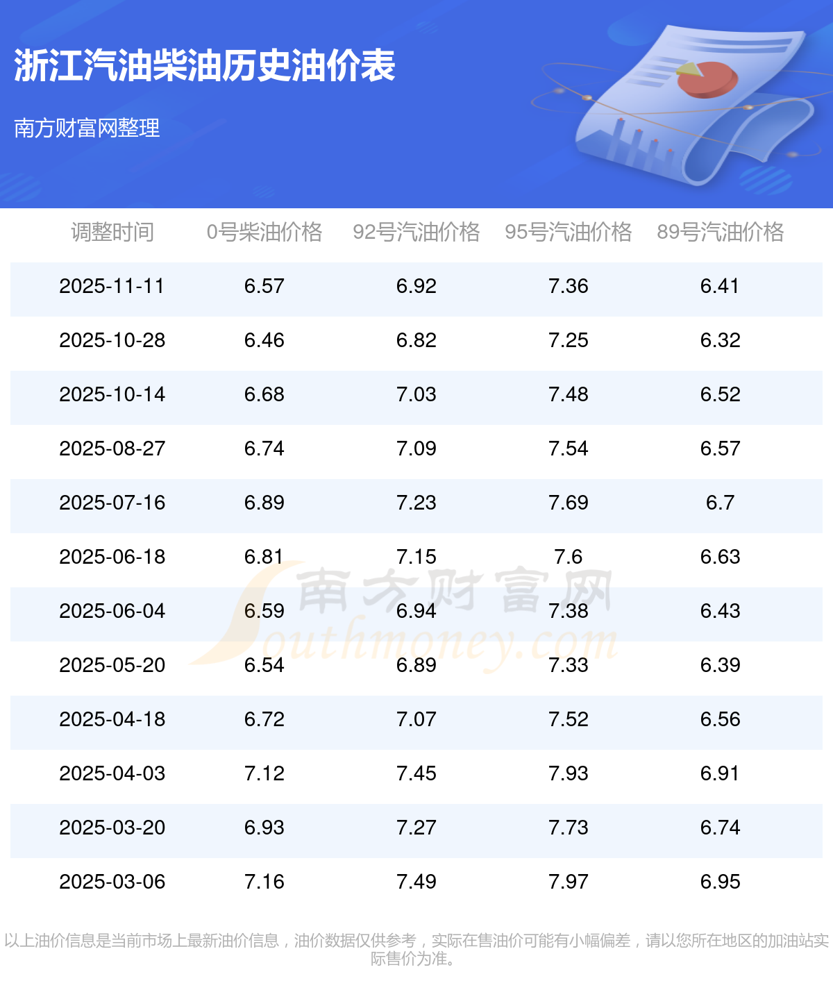 11月19日浙江89号汽油价格是6.41元每升,这是11月11日调整后的价格,相对上一轮调整时间10月28日的油价6.32元/升,上升了0.09元。