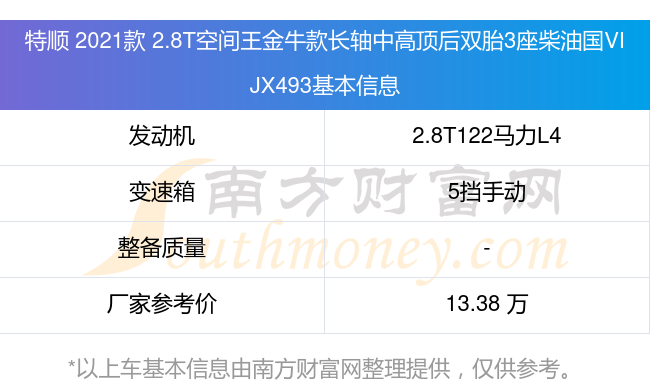 在动力上,特顺 2021款 2.8T空间王金牛款长轴中高顶后双胎3座柴油国VI JX493配备的是一台2.8T122马力L4涡轮增压发动机,匹配的是5挡手动挡变速箱,燃料形式为柴油,厂家参考价13.38万元。