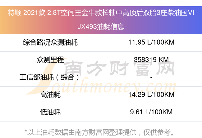 根据车主实测数据,该车型低油耗为9.61L/100km,高油耗为14.29L/100km,综合路况众测油耗为11.95L/100km,工信部综合油耗为-L/100km。