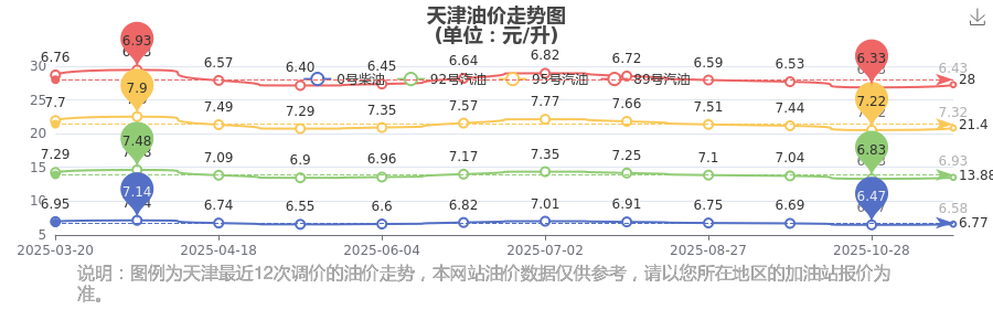 11月19日天津汽油、柴油每升的最新价格:92号汽油6.93元;95号汽油7.32元;89号汽油6.43元,涨了0.1;0号柴油6.58元,本轮油价的调整时间是11月11日。