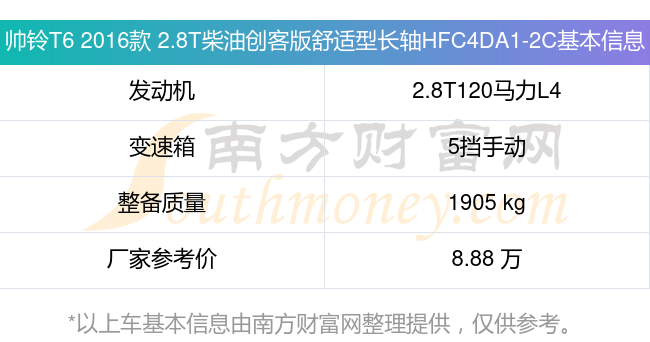 帅铃T6 2016款 2.8T柴油创客版舒适型长轴HFC4DA1-2C动力上配备的是一台2.8T120马力L4涡轮增压发动机,匹配的是5挡手动挡变速箱,燃料形式为柴油,常规整备质量1905kg,厂家参考价8.88万元。