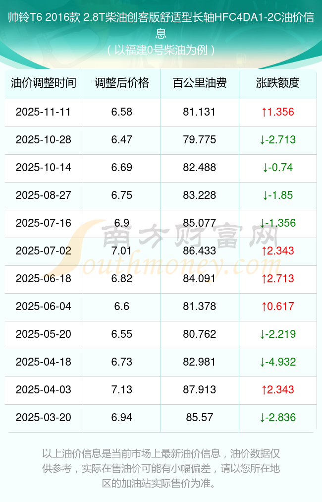 依照11月11日0号柴油最新调整价格6.58元/升来计算(以福建为例),该车型百公里的平均油费是81.131元,依照上一轮10月28日调整价格6.47元/升来计算,百公里的平均油费是79.775元,对比上一轮多花1.356元,下一轮的油价调整时间11月24日24时。