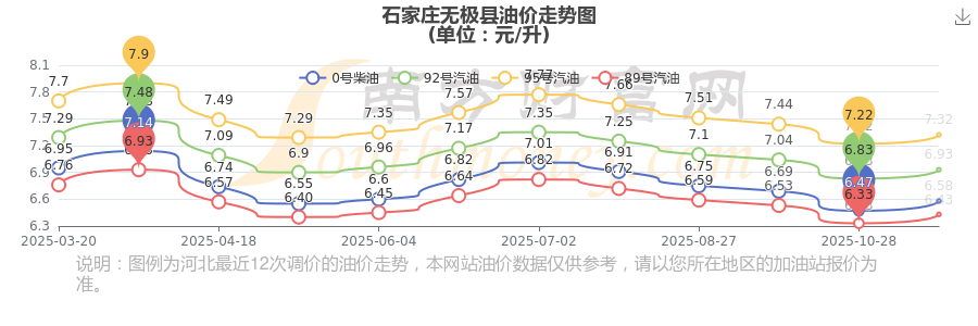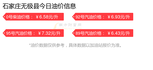 11月19日,石家庄无极县汽油、柴油每升的价格是多少?本次油价调整时间是11月11日,92号汽油为6.93元,升了0.1元,升幅达1.46%;95号汽油为7.32元,升了0.1元,升幅达1.39%;89号汽油为6.43元,升了0.1元,升幅达1.58%;0号柴油为6.58元,升了0.11元,升幅达1.7%。