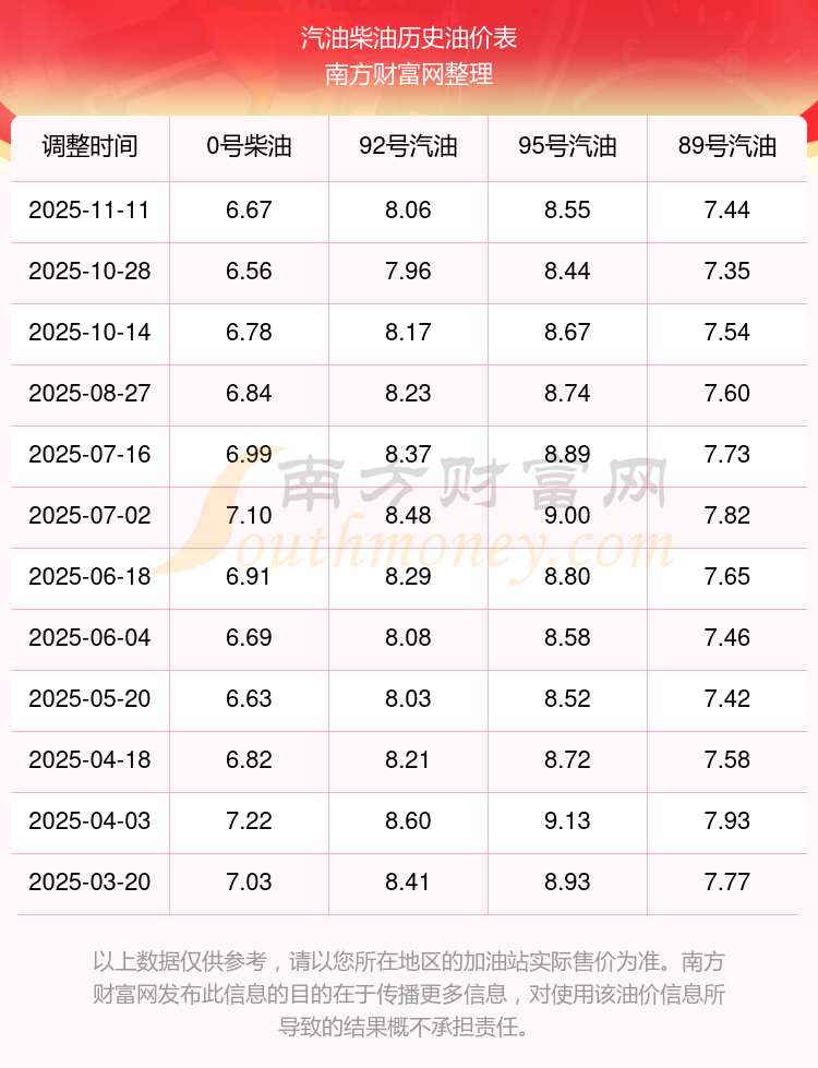 11月19日琼海汽油、柴油每升的价格是11月11日调整后的价格:92号汽油为8.06元,上升了0.1元,上升幅达1.26%;95号汽油为8.55元,上升了0.11元,上升幅达1.3%;89号汽油为7.44元,上升了0.09元,上升幅达1.22%;0号柴油为6.67元,上升了0.11元,上升幅达1.68%。下一轮油价调整时间11月24日24时,距离现在还有5.29天。