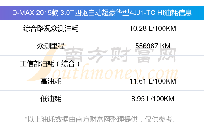 D-MAX 2019款 3.0T四驱自动超豪华型4JJ1-TC HI动力方面,搭载的是一台3.0T177马力L4涡轮增压发动机,匹配6挡手自一体自动档变速箱,燃料形式为柴油,常规整备质量2000kg,厂家参考价19.48万元。