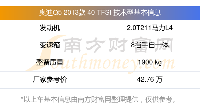 奥迪Q5 2013款 40 TFSI 技术型动力方面,搭载的是一台2.0T211马力L4涡轮增压发动机,匹配8挡手自一体自动档变速箱,燃料形式为汽油,常规整备质量1900kg,厂家参考价42.76万元。