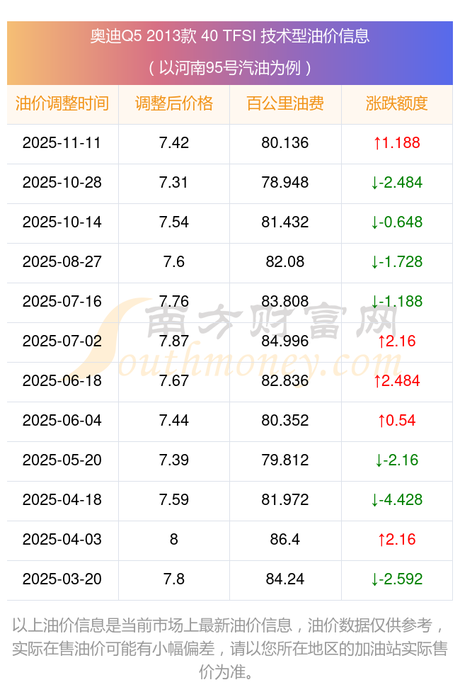 根据11月11日95号汽油最新调整价格7.42元/升来计算(以河南为例),该车型每百公里的平均油费是80.136元,上一轮10月28日调整价格7.31元每升来计算,每百公里的平均油费是78.948元,对比上一轮多花1.188元,下一轮的油价调整时间是11月24日24时。