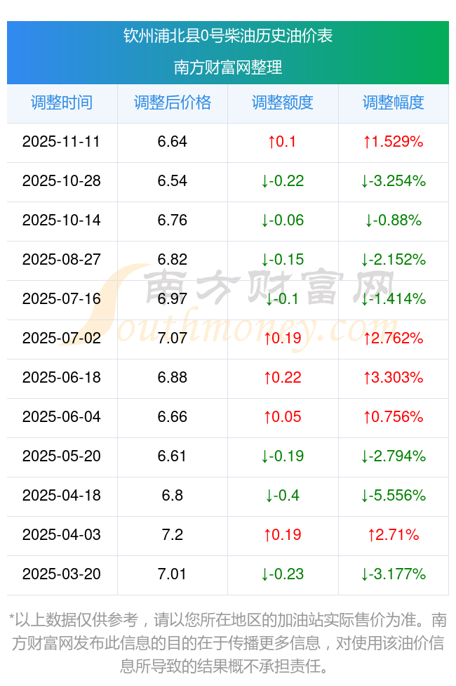钦州浦北县0号柴油11月19日最新价格为6.64元每升,本轮油价调整时间为11月11日,相对上次调整时间10月28日的油价6.54元每升,共升了0.1元,升1.529%。