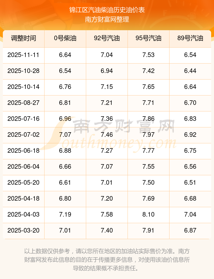 11月19日,锦江区汽油、柴油每升最新价格:调整时间为11月11日,92号汽油为7.04元,上涨了0.1元,上涨幅达1.44%;95号汽油为7.53元,上涨了0.11元,上涨幅达1.48%;89号汽油为6.54元,上涨了0.1元,上涨幅达1.55%;0号柴油为6.64元,上涨了0.1元,上涨幅达1.53%。