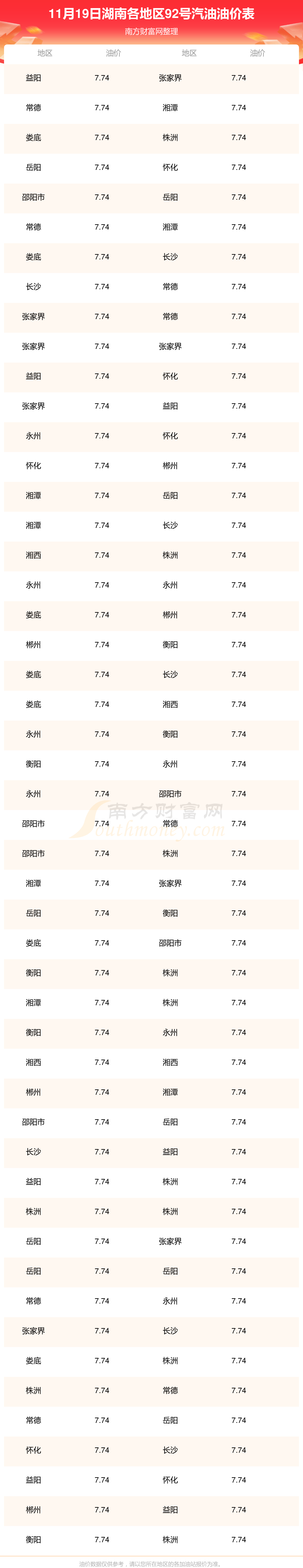11月19日湖南92号汽油价格是11月11日调整后的价格,具体价格是6.9元每升,相对上轮调整时间10月28日的油价6.8元/升,共升了0.1元。