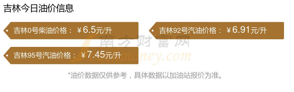 吉林汽油、柴油11月19日每升最新价格多少钱一升?本次油价调整时间为11月11日,92号汽油为6.91元,上调了0.11元;95号汽油为7.45元,上调了0.11元;0号柴油为6.5元,上调了0.1元。