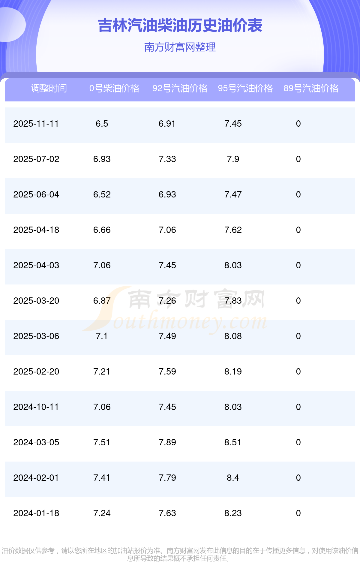 吉林2025年最新汽油柴油历史油价表