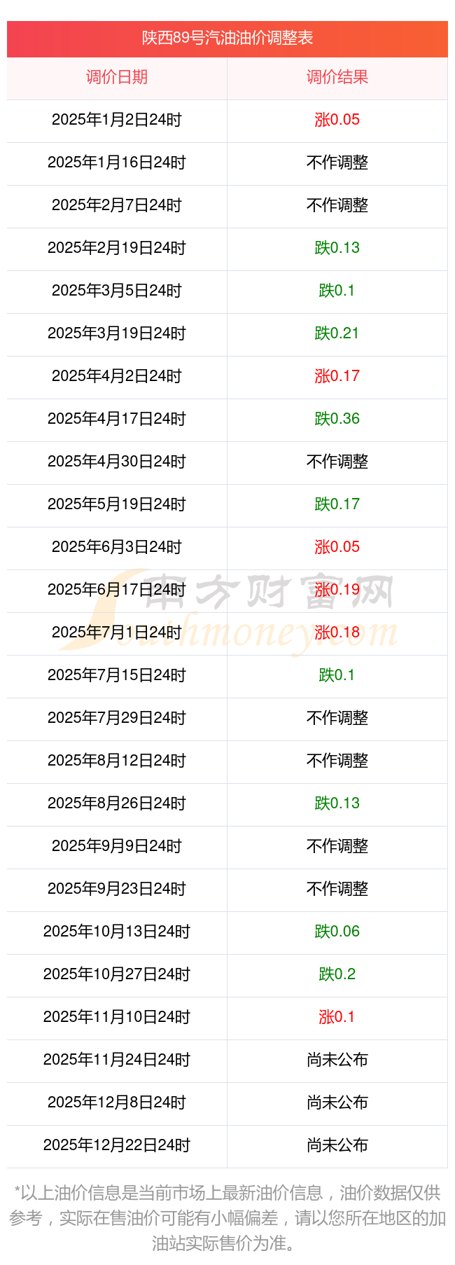 11月19日西安汽油柴最新油价是多少?具体每升为:11月11日调整后,92号汽油为6.83元,上涨了0.1元,上涨幅达1.49%;95号汽油为7.22元,上涨了0.11元,上涨幅达1.55%;89号汽油为6.45元,上涨了0.1元,上涨幅达1.58%;0号柴油为6.48元,上涨了0.1元,上涨幅达1.57%。