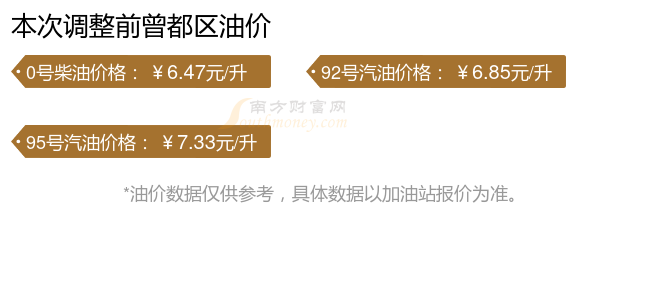 11月19日,曾都区汽油、柴油每升最新价格:调整时间为11月11日,92号汽油为6.95元,涨了0.1元,涨幅达1.46%;95号汽油为7.44元,涨了0.11元,涨幅达1.5%;0号柴油为6.57元,涨了0.1元,涨幅达1.55%。