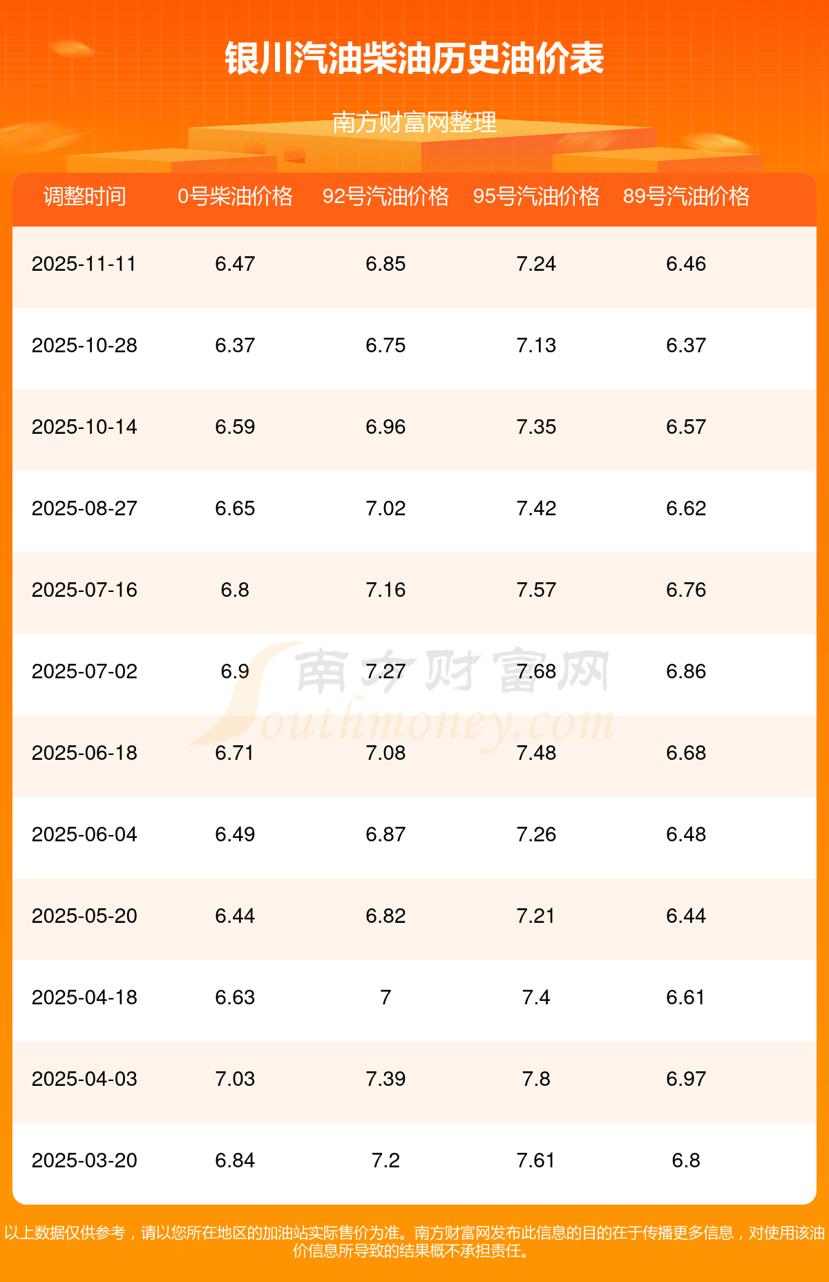 11月19日,银川汽油、柴油每升的价格为11月11日调整后的价格,具体为:92号汽油为6.85元,上升了0.1元,上升幅达1.48%;95号汽油为7.24元,上升了0.11元,上升幅达1.54%;89号汽油为6.46元,上升了0.09元,上升幅达1.41%;0号柴油为6.47元,上升了0.1元,上升幅达1.57%。