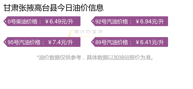 甘肃张掖高台县汽油、柴油11月19日每升最新价格为:0号柴油为6.49元,上升了0.1元;95号汽油为7.4元;92号汽油为6.94元;89号汽油为6.41元,调整时间为11月11日。