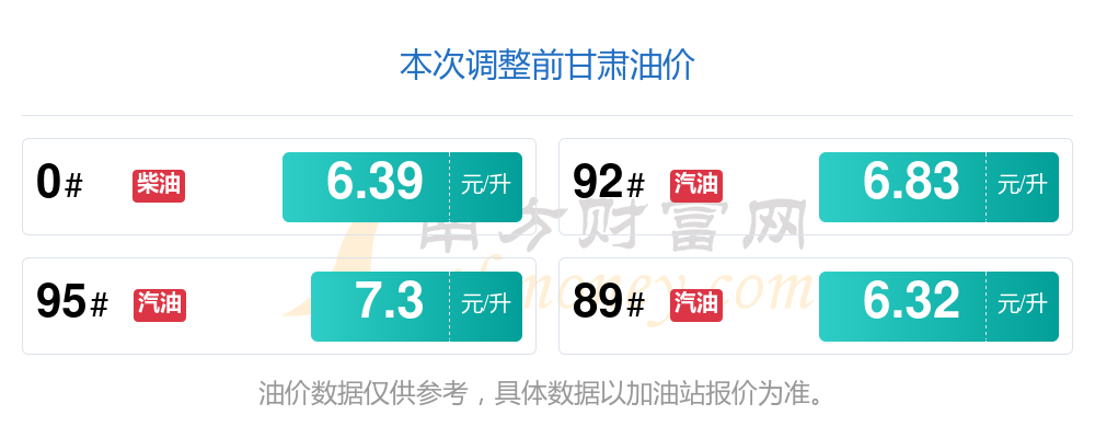 甘肃汽油、柴油11月19日每升最新价格多少钱一升?本次油价调整时间为11月11日,92号汽油为6.94元,上涨了0.11元;95号汽油为7.4元,上涨了0.1元;89号汽油为6.41元,上涨了0.09;0号柴油为6.49元,上涨了0.1元。