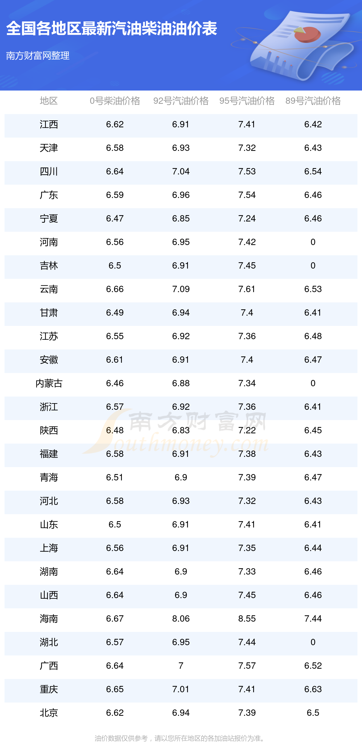 油价最新调整时间为11月11日,全国92号汽油最新平均价格为:7元每升,其中,最低为陕西,价格为6.83元/升,最高为海南,价格为8.06元/升。全国95号汽油最新平均价格为:7元每升,其中,最低为陕西,价格为7.22元/升,最高为海南,价格为8.55元/升。全国0号柴油最新平均价格为:7元每升,其中,最低为内蒙古,价格为6.46元/升,最高为海南,价格为6.67元/升。全国89号汽油最新平均价格为:7元每升,其中,最低为浙江,价格为6.41元/升,最高为海南,价格为7.44元/升。下一轮油价调整时间11月24日24时,距离现在还有5.24天。