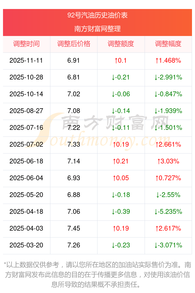 油价调整最新消息:下一轮油价调整时间11月24日24时。11月19日,山东汽油、柴油每升最新价格为:调整时间为11月11日,92号汽油为6.91元,上升了0.1元,上升幅达1.47%;95号汽油为7.41元,上升了0.11元,上升幅达1.51%;89号汽油为6.41元,上升了0.09元,上升幅达1.42%;0号柴油为6.5元,上升了0.1元,上升幅达1.56%。