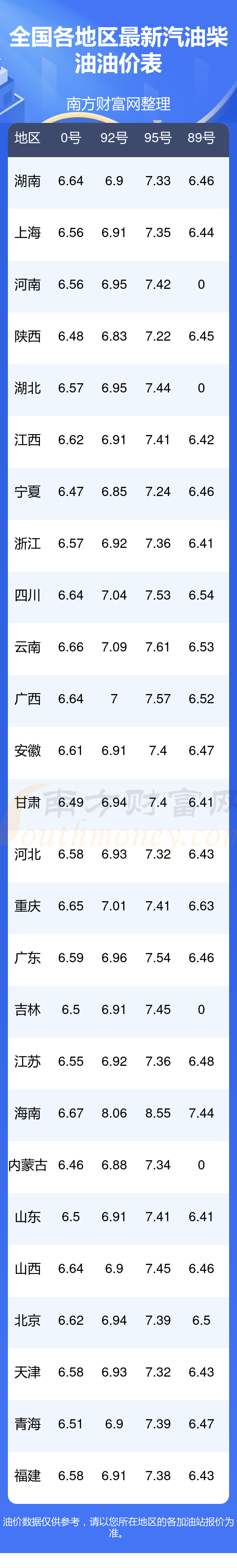2025年11月19日全国油价调整及最新汽油价格表