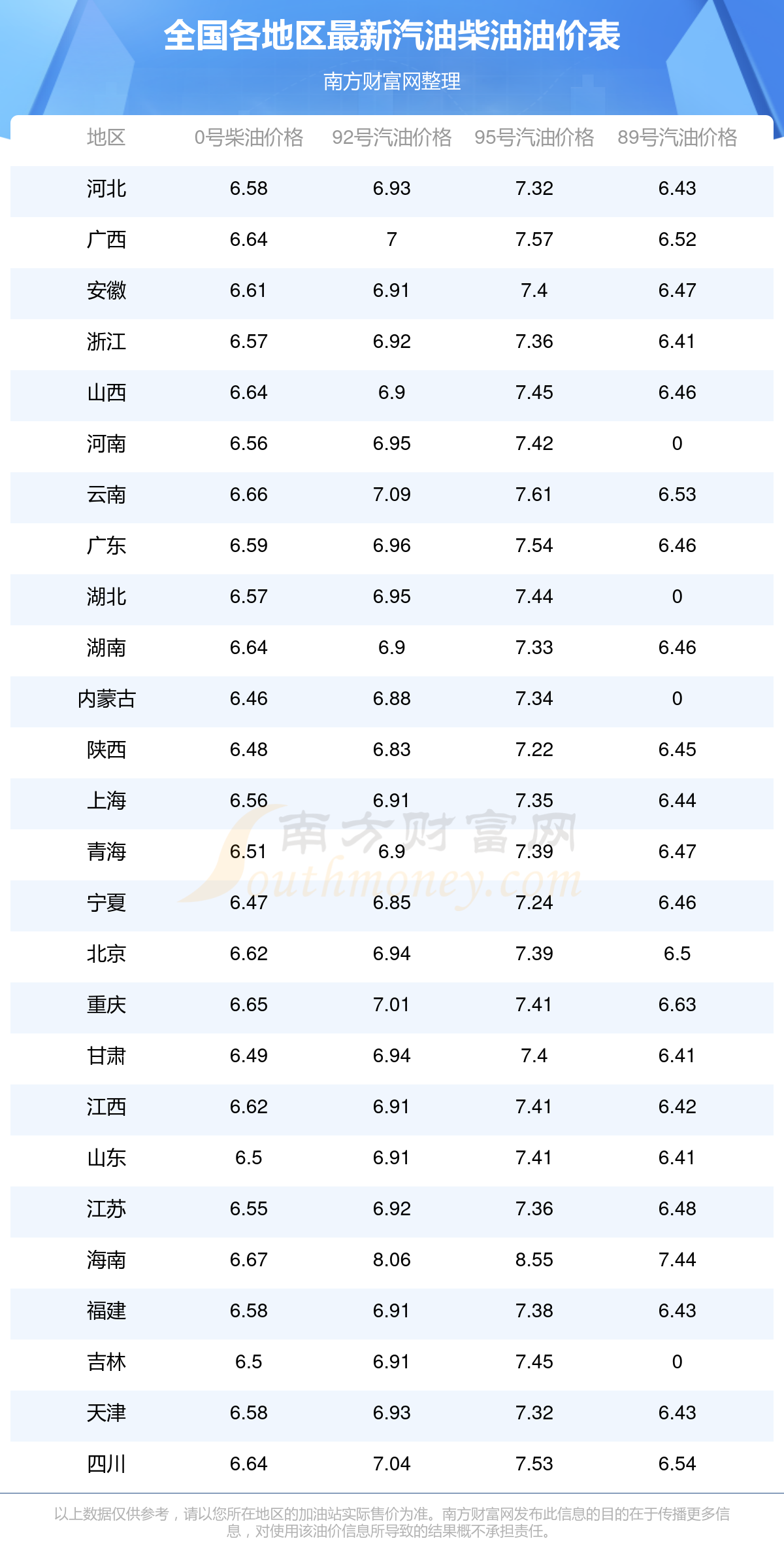 11月19日全国89号汽油的价格为11月11日油价调整后的价格,其中,平均价格为7元每升,最低为浙江,价格6.41元/升,最高为海南,价格7.44元/升。,下一轮油价调整时间11月24日24时,距离现在还有5.22天。