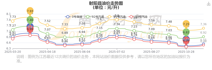 11月19日,射阳县汽油、柴油每升最新价格为:92号汽油为6.92元,升了0.1元;95号汽油为7.36元,升了0.11元;89号汽油为6.48元,升了0.09元;0号柴油为6.55元,升了0.11元,调整时间为11月11日。