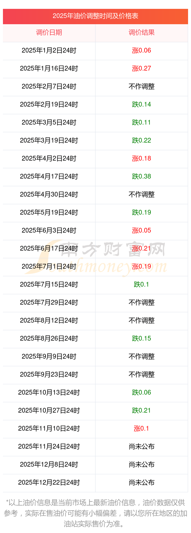 油价调整最新消息:下一轮油价调整时间11月24日24时。11月19日湖北汽油、柴油每升的价格为11月11日调整后的价格,92号汽油为6.95元,增了0.1元,增幅达1.46%;95号汽油为7.44元,增了0.11元,增幅达1.5%;0号柴油为6.57元,增了0.1元,增幅达1.55%。