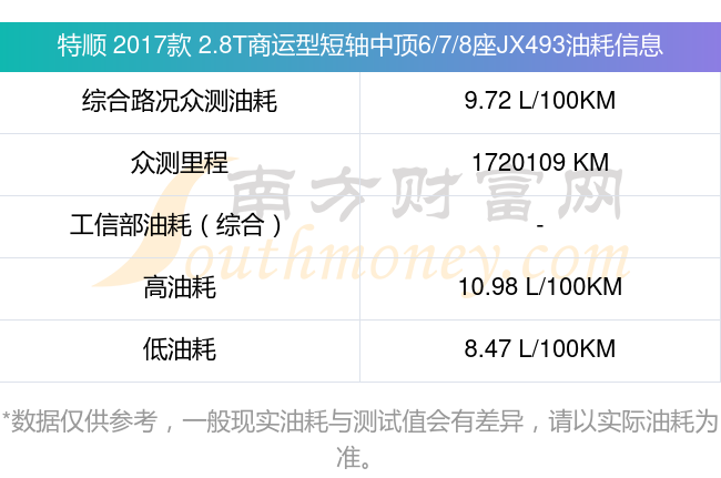 根据多位车主实测得出数据,该车型低油耗为8.47L/100km,高油耗为10.98L/100km,综合路况众测油耗为9.72L/100km,工信部综合油耗为-L/100km。