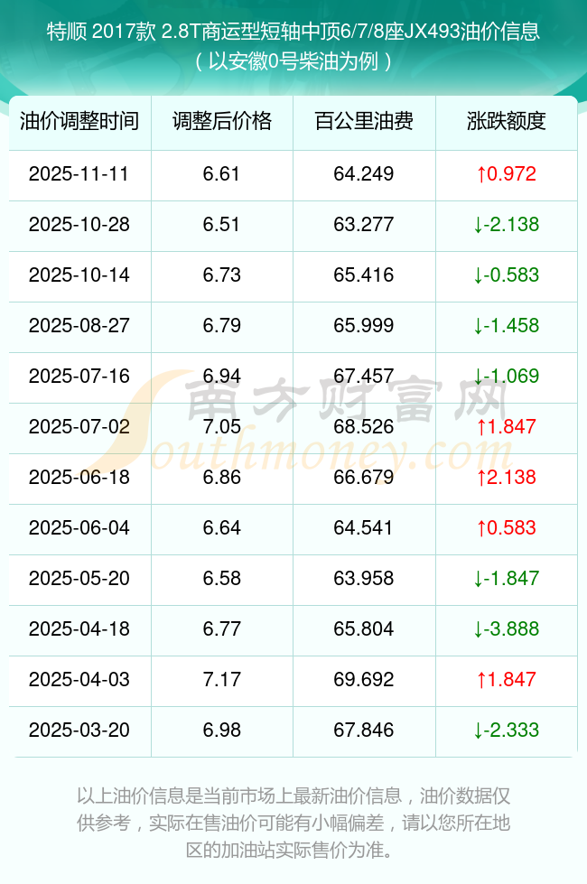 按11月11日0号柴油最新调整价格6.61元每升来计算(以安徽为例),该车型百公里平均油费为64.249元,按上一轮10月28日调整价格6.51元每升来计算,百公里平均油费为63.277元,对比上一轮多花0.972元,下一轮油价调整时间为11月24日24时。