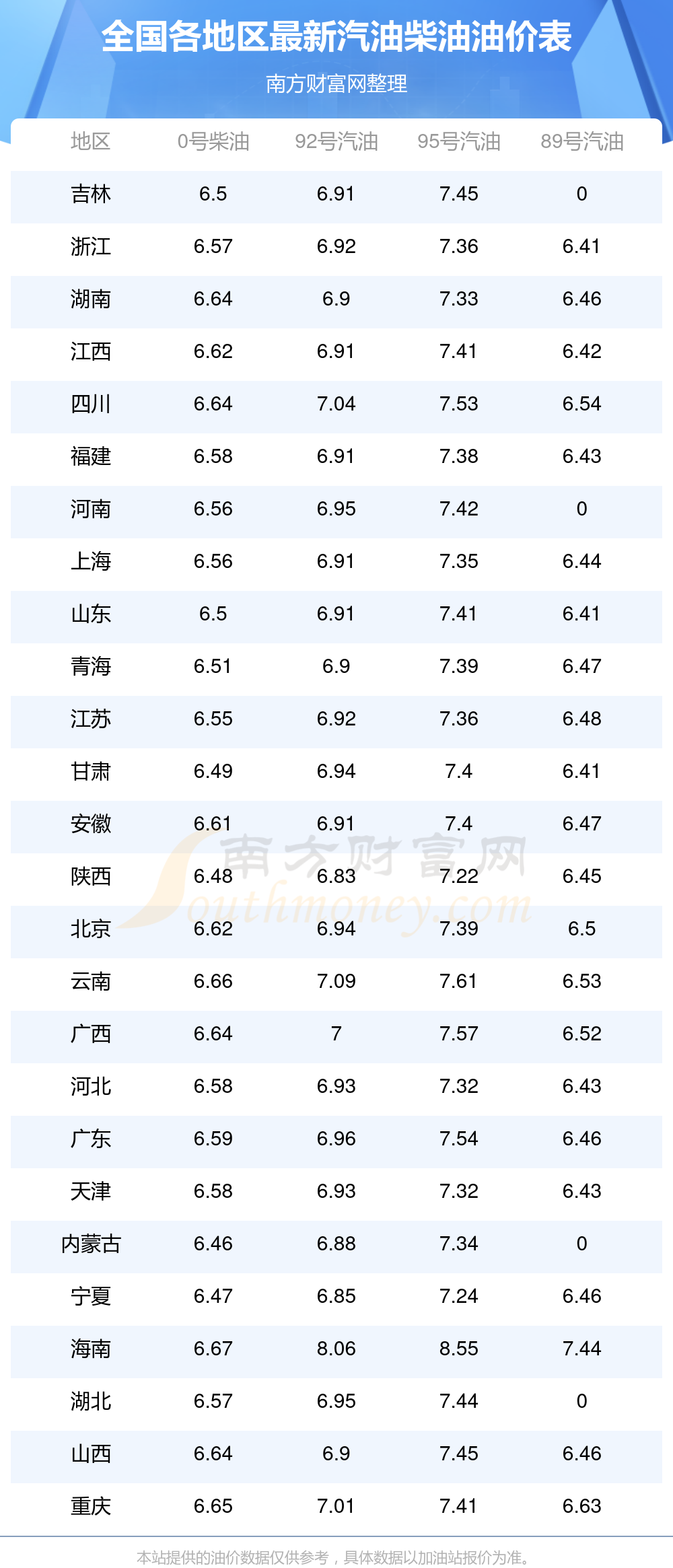 油价数据仅供参考,请以您所在地区的各加油站报价为准。