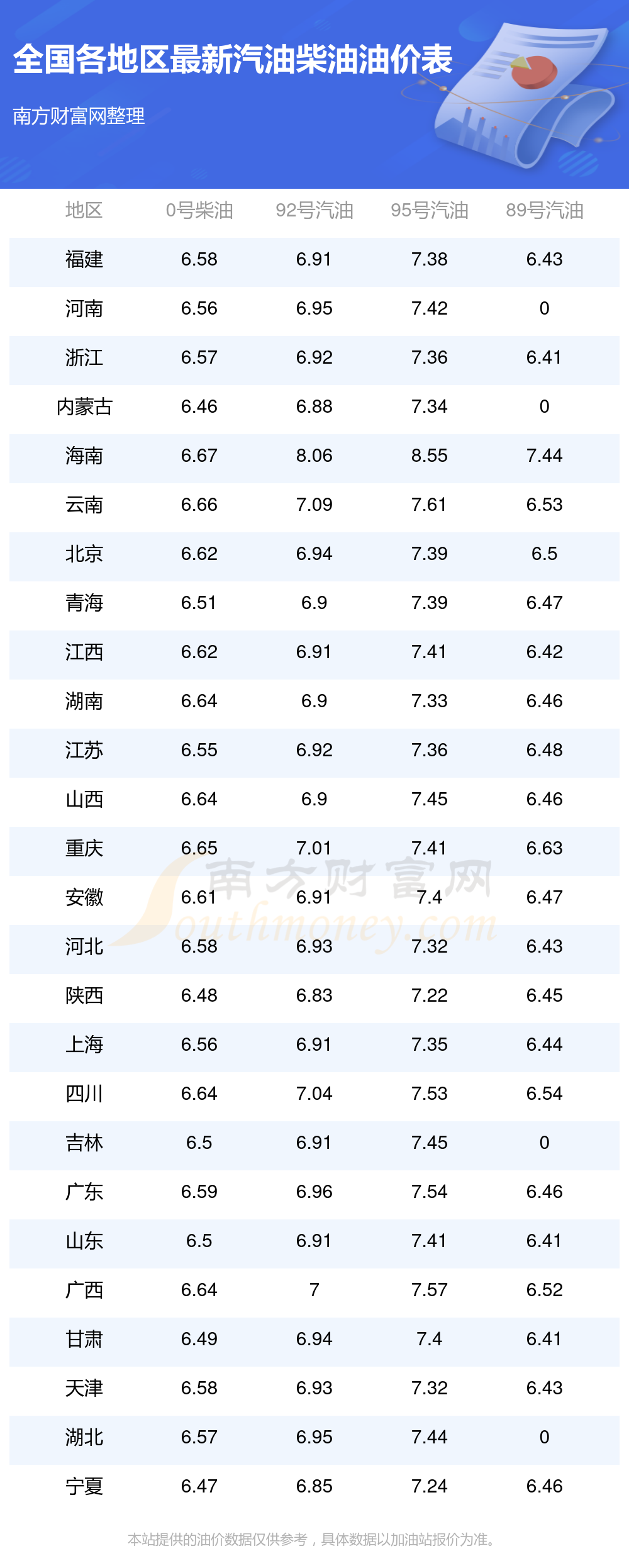 油价最新调整时间为11月11日 ,全国92号汽油最新平均价格为:7元每升,其中,最高为海南,价格为8.06元/升,最低为陕西,价格为6.83元/升。全国95号汽油最新平均价格为:7元每升,其中,最高为海南,价格为8.55元/升,最低为陕西,价格为7.22元/升。全国0号柴油最新平均价格为:7元每升,其中,最高为海南,价格为6.67元/升,最低为内蒙古,价格为6.46元/升。全国89号汽油最新平均价格为:7元每升,其中,最高为海南,价格为7.44元/升,最低为浙江,价格为6.41元/升。,下一轮油价调整时间11月24日24时,距离现在还有5.17天。