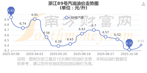 11月19日,浙江89号汽油的价格是6.41元每升,本次的调整时间为11月11日,对比上次的调整上升了0.09元,上升1.424%,11月24日24时为下一轮油价调整时间,还有5.16天。
