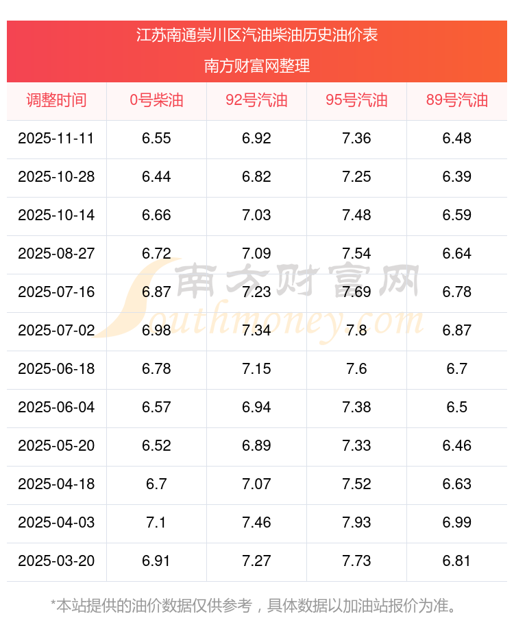 油价调整最新消息:下一轮油价调整时间11月24日24时。11月19日,江苏南通崇川区汽油、柴油每升最新价格为(11月11日调整后的价格):92号汽油为6.92元,上涨了0.1元,上涨幅达1.47%;95号汽油为7.36元,上涨了0.11元,上涨幅达1.52%;89号汽油为6.48元,上涨了0.09元,上涨幅达1.41%;0号柴油为6.55元,上涨了0.11元,上涨幅达1.71%。