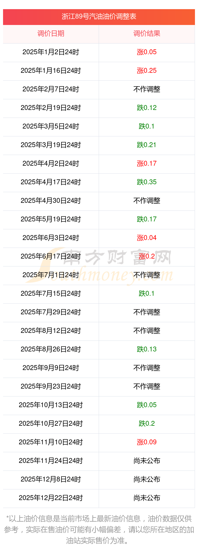 浙江89号汽油油价调整表