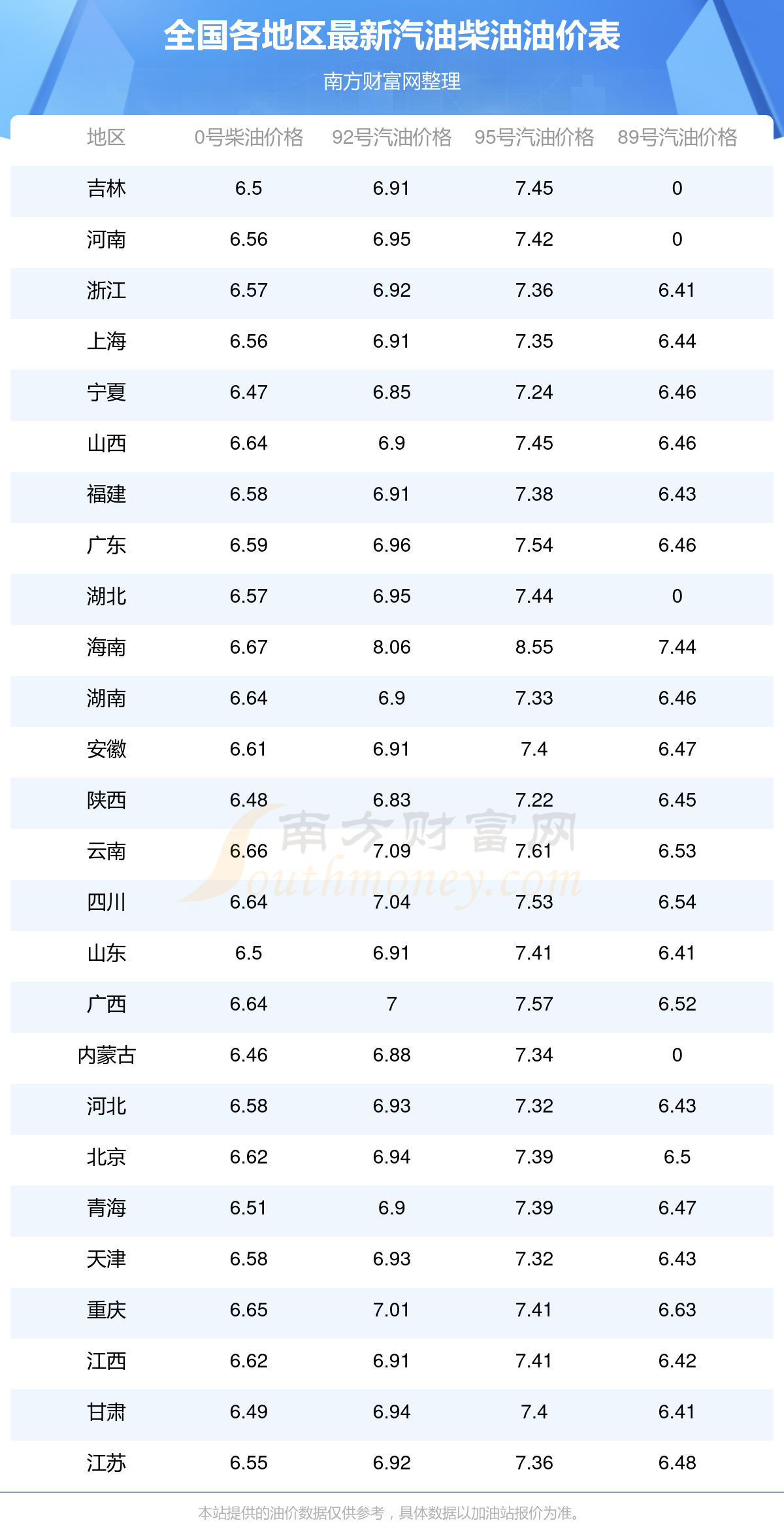 全国89号汽油平均价格为:7元每升,其中,最低为浙江,价格6.41元/升,最高为海南,价格7.44元/升。